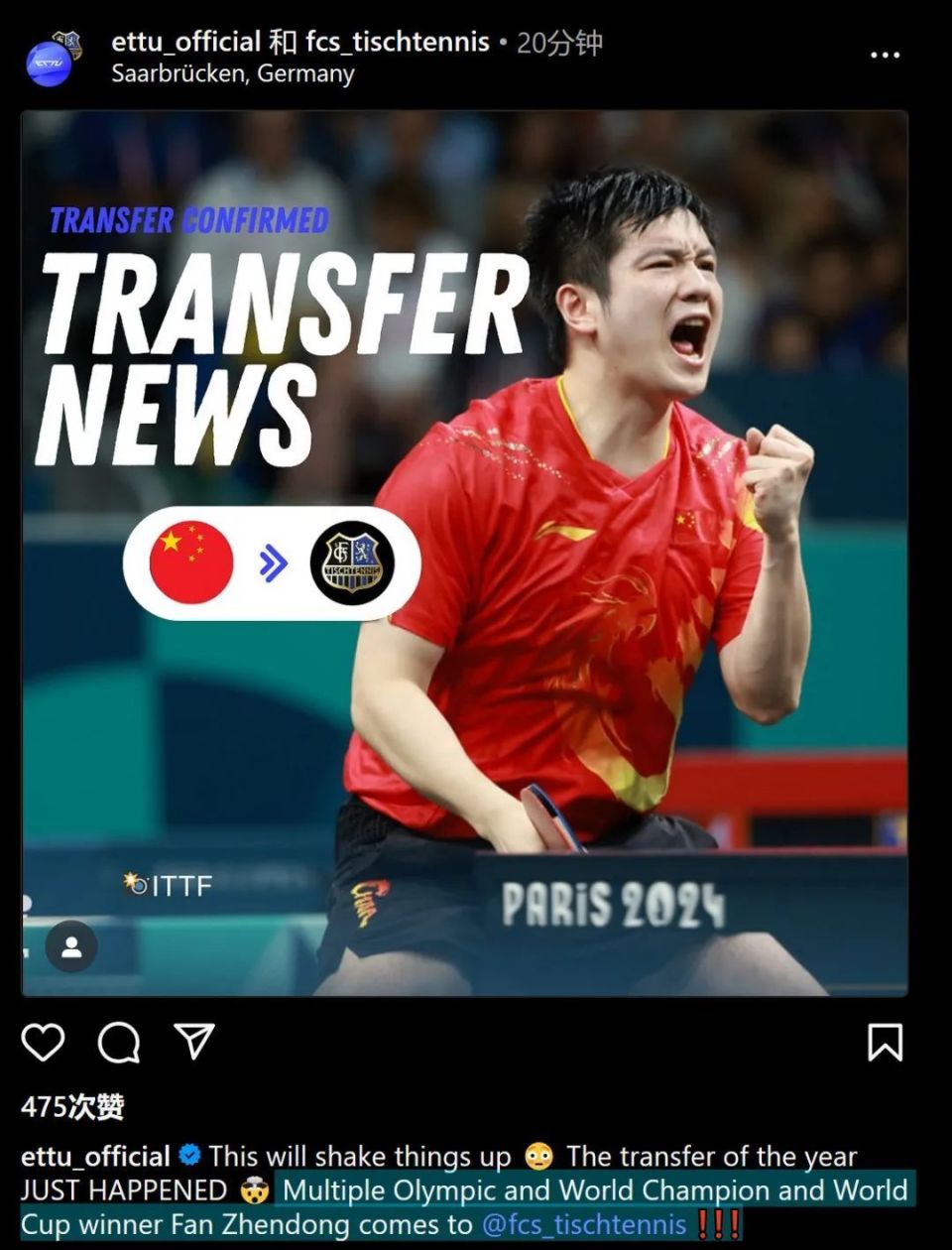6月1日,据央视新闻消息,德甲联赛萨尔布吕肯乒乓球甲级俱乐部宣布,奥运冠军樊振东加盟。在俱乐部官方声明中,樊振东表示:我真的很期待在萨尔布吕肯和德甲的新挑战,体验新的环境——并与球队一起赢得更多的胜利。